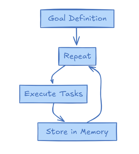 The Agent then breaks down goals into smaller tasks. For example, a goal might translate into web searches (one or more) followed by synthesising the results into a summary.