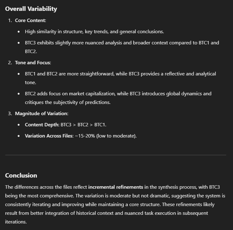 In one experiment, I tasked the system with generating three iterations of an article about Bitcoin’s 2025 price predictions. The second iteration showed: