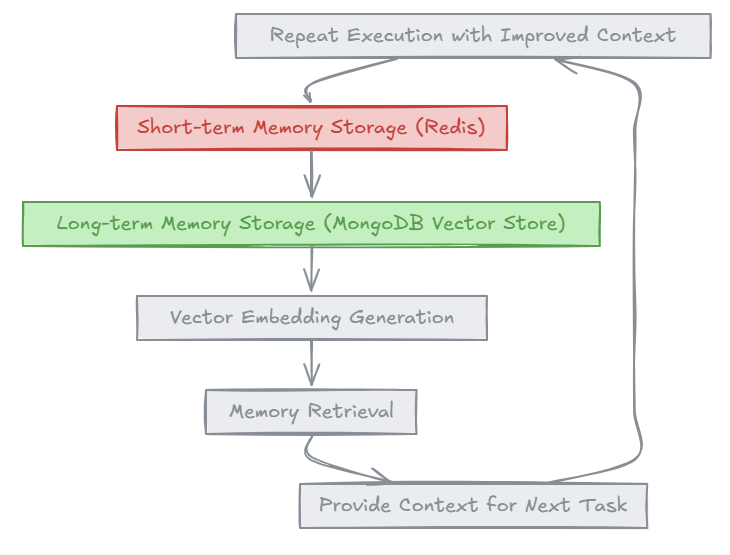 Results from previous executions are stored in a vector database and retrieved for context in subsequent runs.