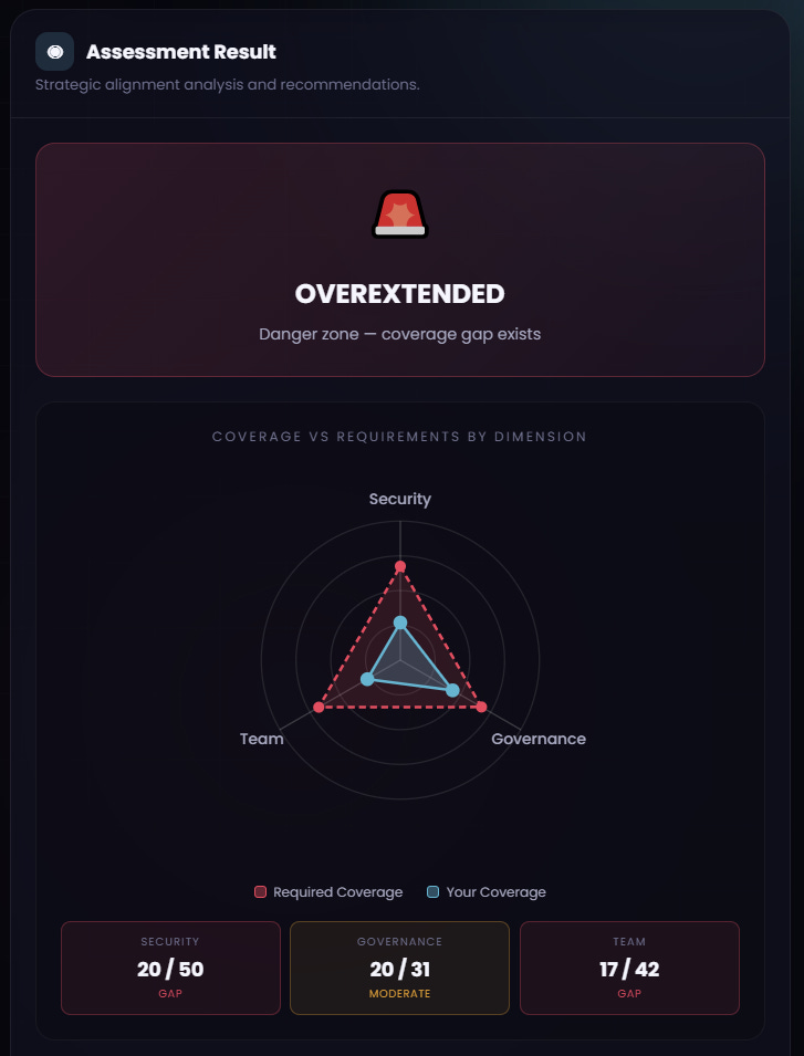 I’ve built a tool that calculates your Coverage vs Surface Area ratio and tells you whether you’re Aligned, Overextended, or Underutilised. It also breaks down where your gaps are across Security, Governance, and Team.