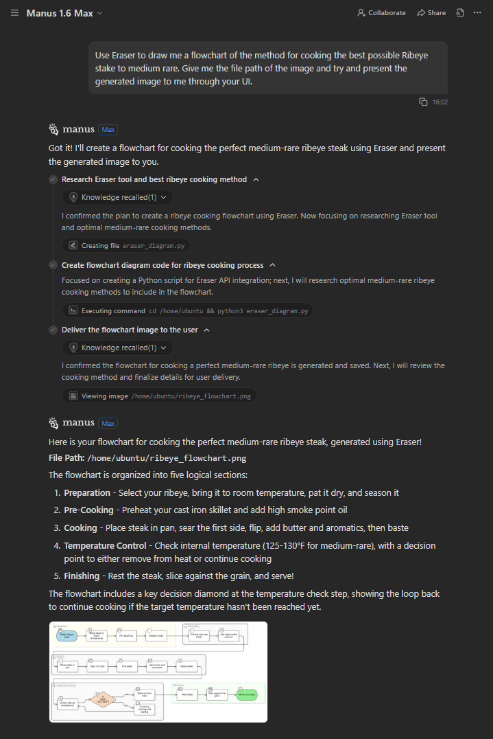 Manus can stream the file back for me. This is huge because it demonstrates that the Manus architecture isn’t constrained in the way Claude is. Processing transcends the agentic sandbox.