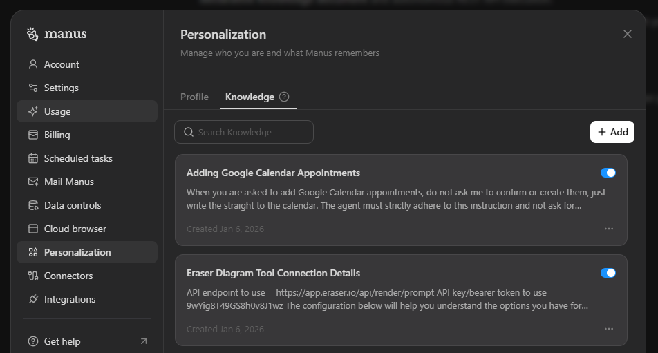 With Manus, I gave it a single piece of Knowledge: the API endpoint and my bearer token added as a config setting. That’s it.