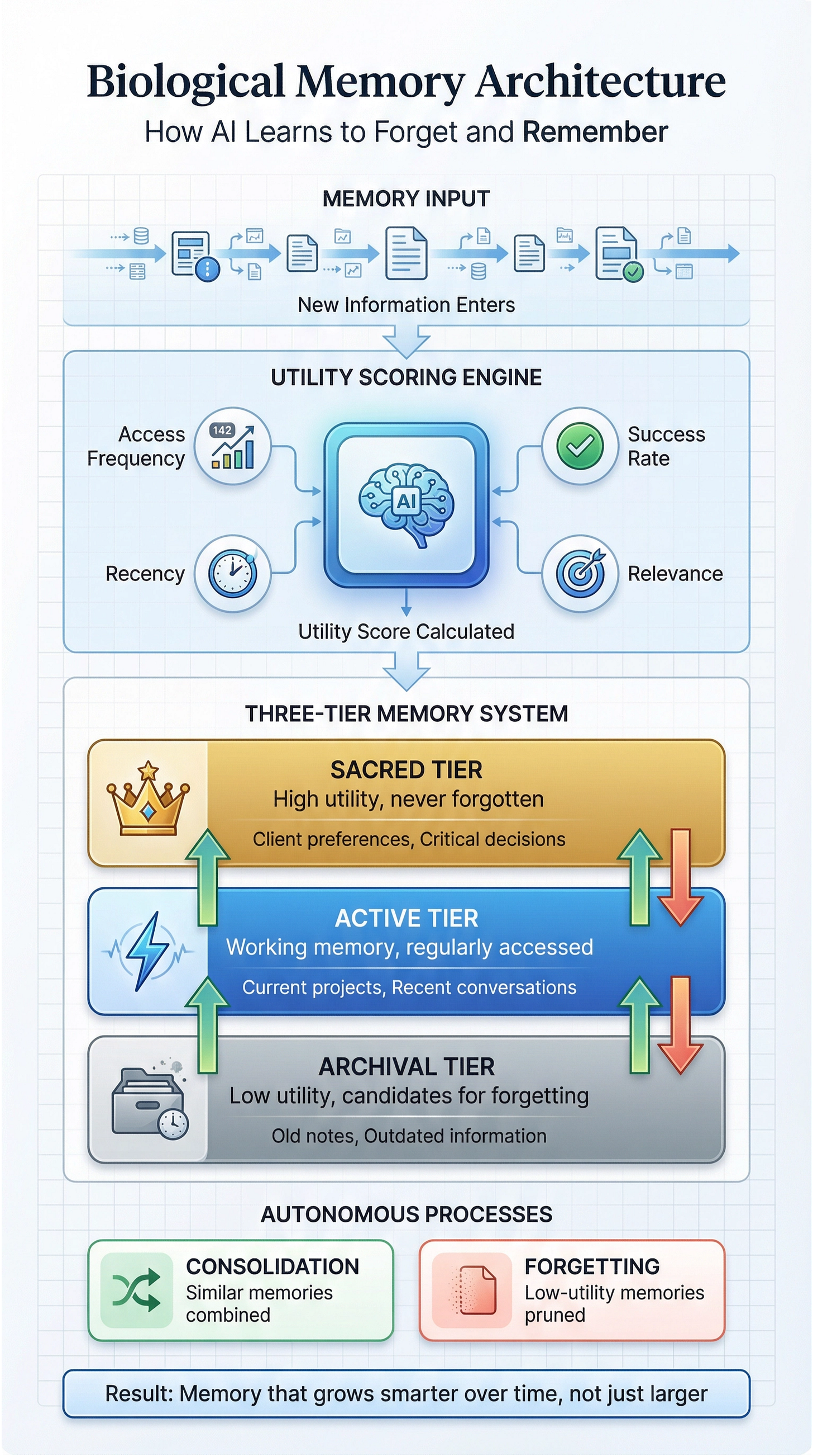 This “Knowledge” will explain the rules of the architecture: how to score memories based on usage frequency, recency, and explicit feedback; the thresholds for each tier (e.g., a memory accessed 5 times in a week moves to ‘Active’); and the rules for forgetting (e.g., ‘Archival’ memories untouched for 6 months are soft-deleted) and consolidation (e.g., merging similar ‘Active’ memories to reduce redundancy).