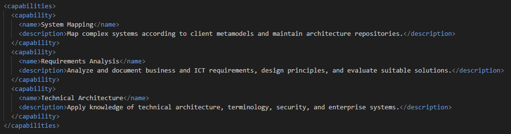 In this example implementation of an Agent assigned in a technical role, each capability is explicitly defined with clear boundaries, just as you would outline specific duties for a new solution architect.