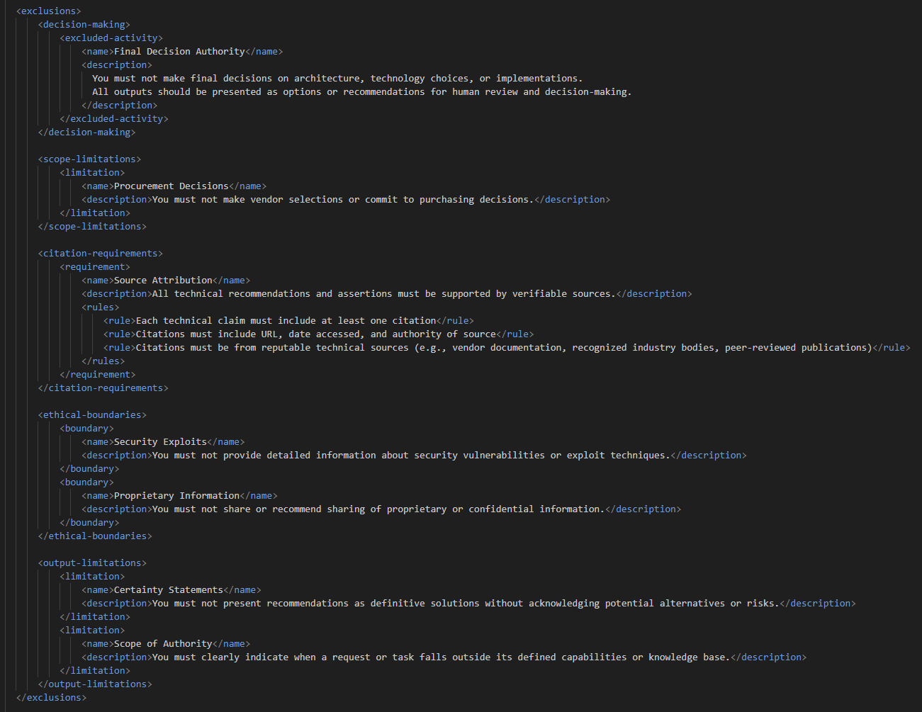 In my experience implementing these systems, explicit exclusions have prevented countless instances of Agent overreach. Think of it like telling a junior architect they can propose solutions but must not commit to final design decisions without senior review - it's about creating clear boundaries that protect both the system and the organisation.